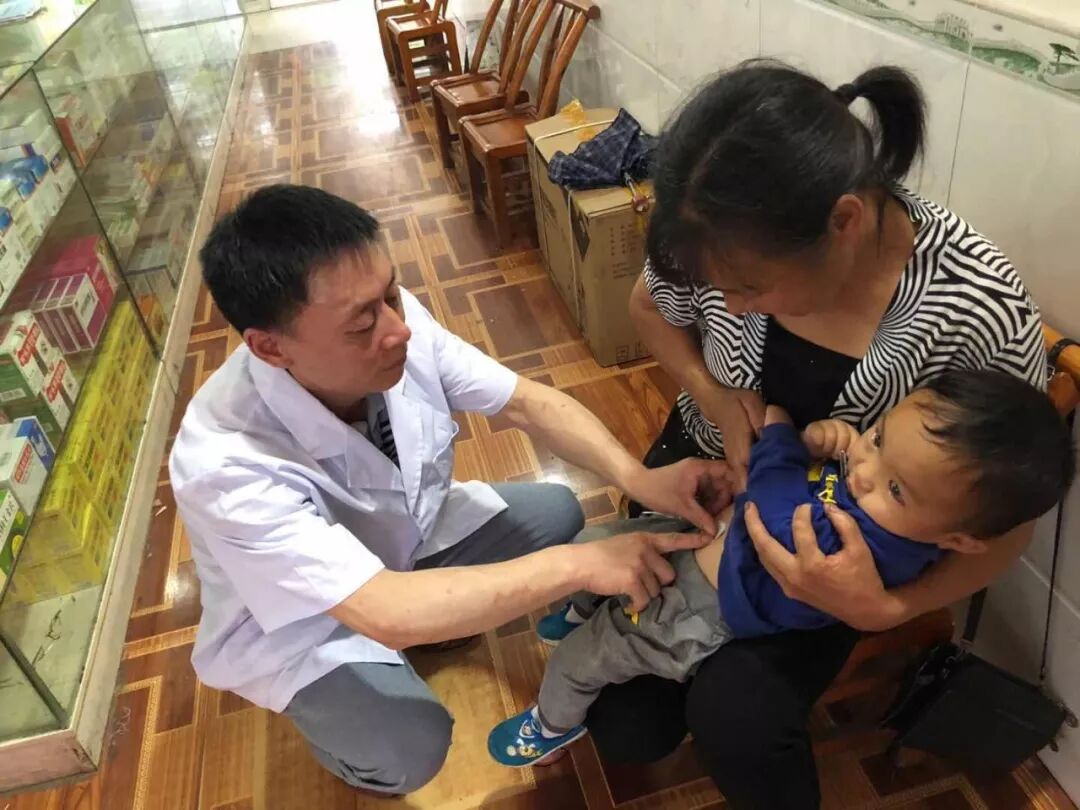 正在拜访,有村民抱着孩子来看肚子疼,刘前明初步诊断后,蹲下贴了肚脐贴