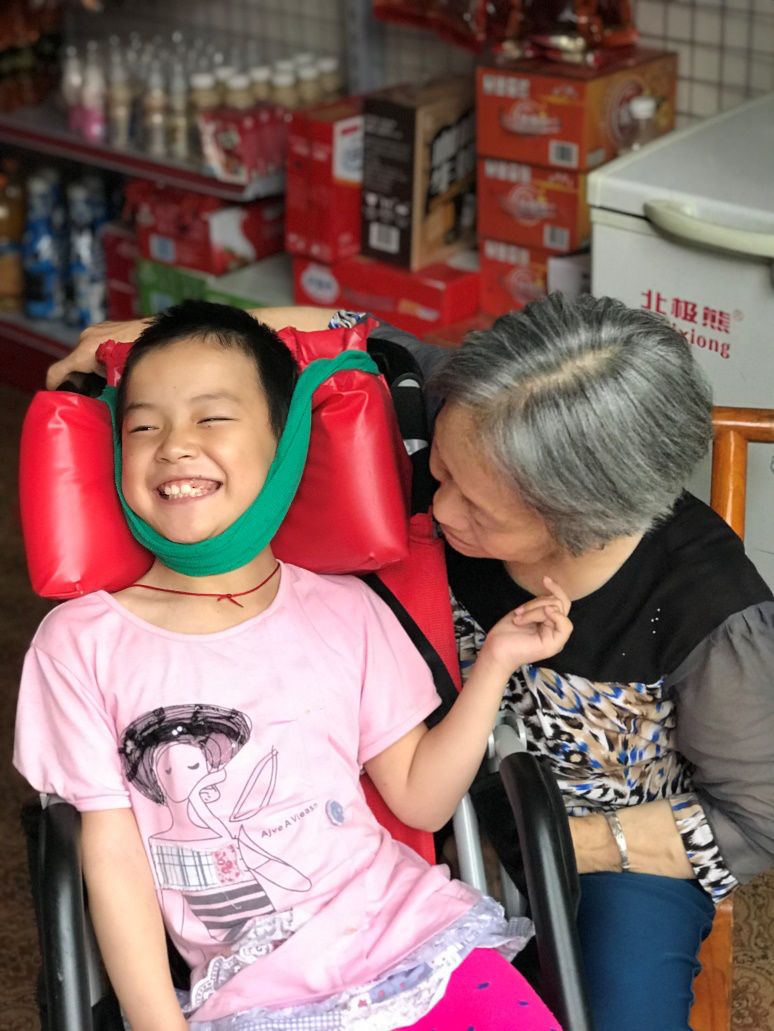 杨伟强俯身和9岁的小女孩说话,小女孩忽然咧开嘴灿烂一笑。照顾她的奶奶说,觉得你们对她好,她高兴。
