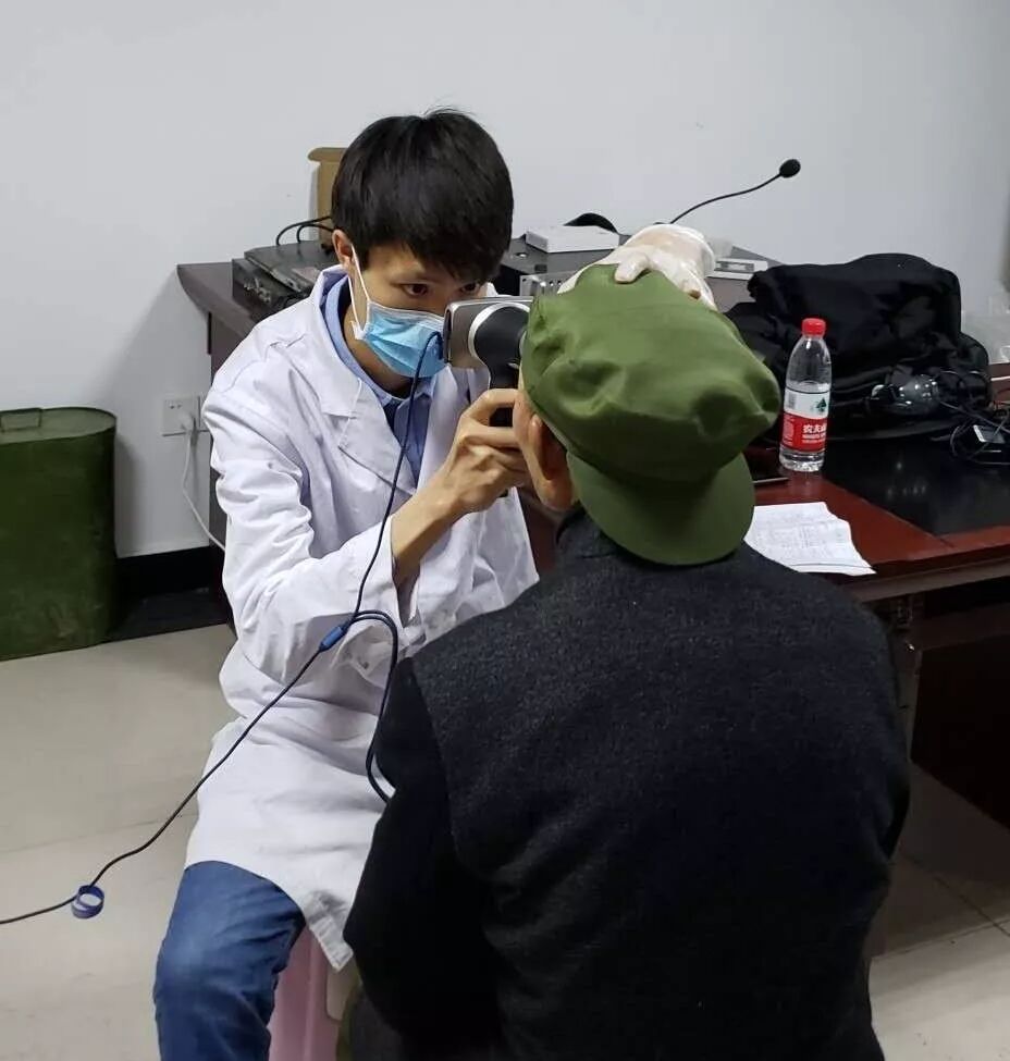 “乡村医生”项目引入“未来诊室”计划,落地重庆市石柱县中益乡。工作人员正在用眼底镜为65岁以上老人做公卫体检。