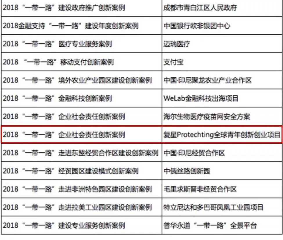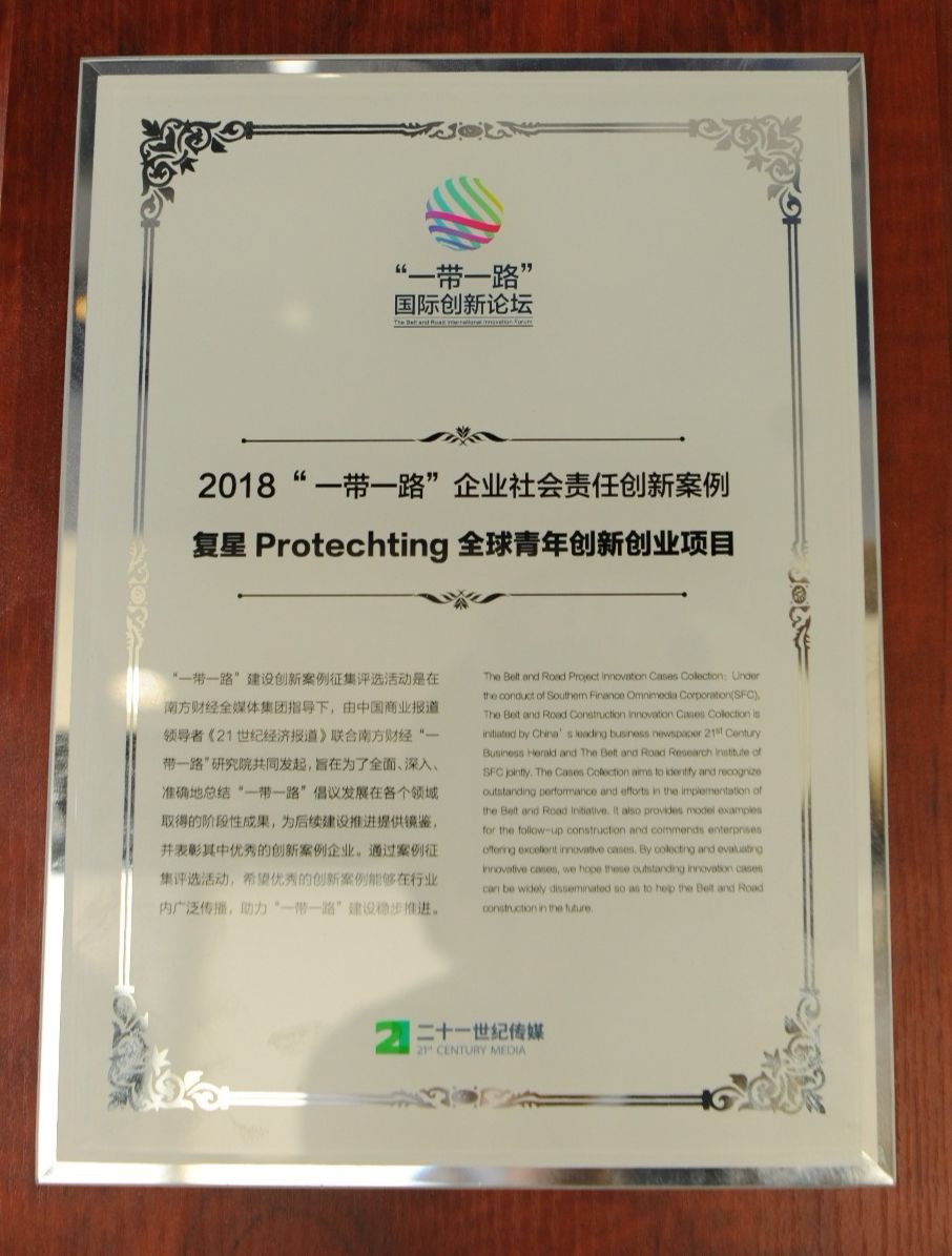 12月14日, 2018“一带一路”国际创新论坛暨“一带一路”建设创新案例征集活动获选案例颁布仪式在北京JW万豪酒店隆重举行。来自政府、商界和媒体的1000多位嘉宾与会,共同探讨“一带一路”上蓬勃发展的新经济、新业态。活动上,复星“Protechting全球青年创新创业项目”被授予 2018 “一带一路”企业社会责任创新案例,将与支付宝、中国银行欧非银团中心、普华永道“一带一路”全景平台等收录在《“一带一路”创新案例集》。