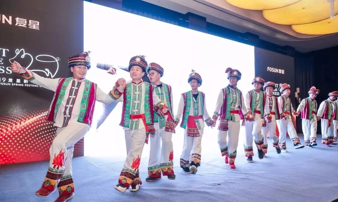 26日晚,三十八名勇士中的十一名骨干成员,“伪装”成彝族小伙,“潜伏”到2019复星新年团拜会。他们在会场载歌载舞,为大家送去新春祝福,瞬间燃爆全场现场。