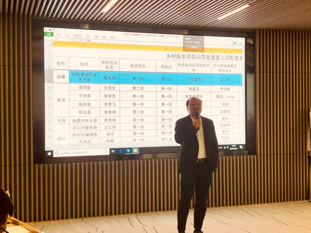 复星全球合伙人、 复星医药总裁吴以芳同学向队员介绍了自己对口县吉木乃县的情况和自己调研当地的感受,并告诉队员们,复星所有的全球合伙人都是队员在外驻点的坚实后盾。