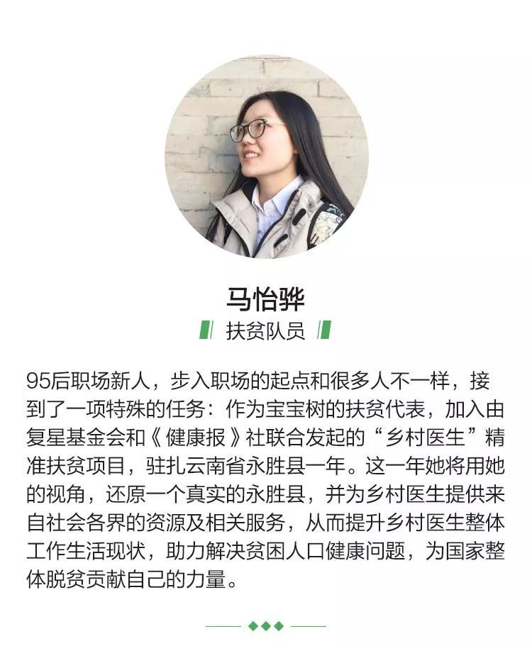 前辈们常常对我说,人生的第一份工作意义重大,它可能决定了一位初出茅庐的年轻人未来的方向。我想在这一点上,我是幸运的,能够加入宝宝树,和一群有活力、有理想的伙伴朋友们一起,做一份温暖的事业。作为宝宝树最年轻的员工之一,我对未来有很多憧憬,很多假设,然而没有想到的是,在这里我走上了一条与众不同的艰难之路,但却又是让我了解到世界最真实的一面,实现人生价值的一条路——我加入到“乡村医生”精准扶贫的公益项目,作为一名光荣的扶贫队员,驻扎到云南省永胜县,为当地的650名乡村医生,以及这些乡村医生背后的6万贫困人口和他们的家庭,带去温暖与帮助,也代表宝宝树,为他们带去中国千万家庭的关怀。